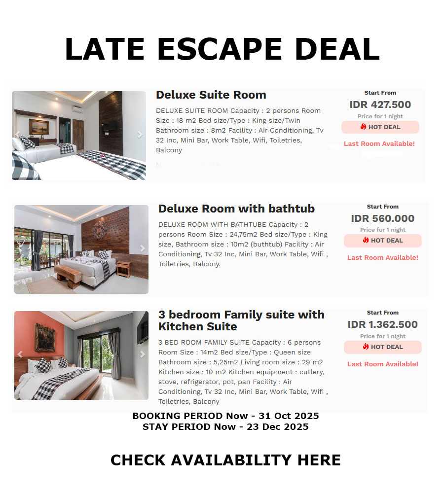 At the hotel rooms are equipped with air conditioning and a flat-screen TV.The area is popular for cycling, and bike hire is available at this 4-star hotel.Saraswati Temple is 6 km from Pedukuhan Nawa Sakti Resort, while Monkey Forest Ubud is 6.2 km from the property. The nearest airport is Ngurah Rai International Airport, 39 km from the accommodation.